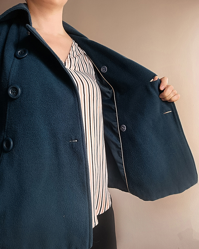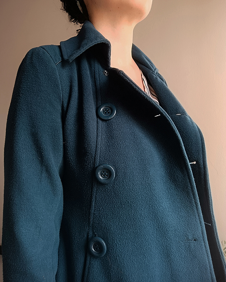 Abrigo azul, muy abrigado y liviano. Con forro interno. Talla S. Medidas: Hombro a hombro: 39cm / Axila a axila: 41cm / Largo de manga: 60cm / Largo total: 62cm