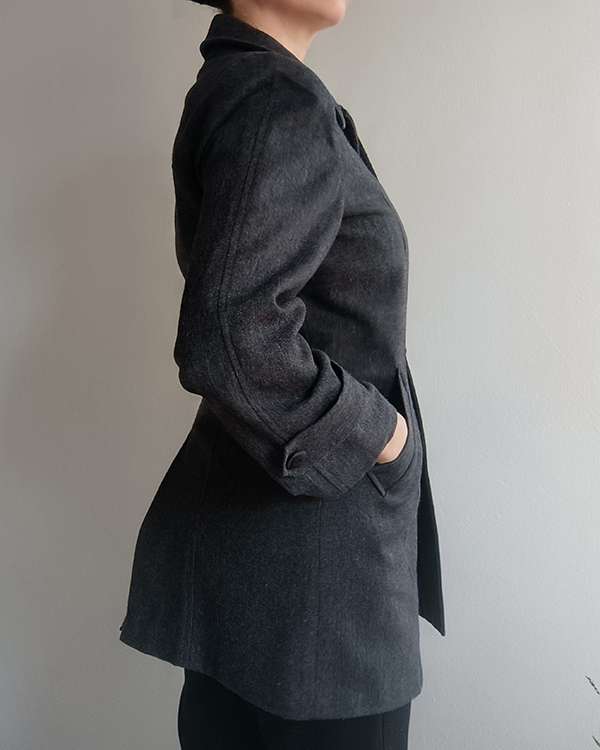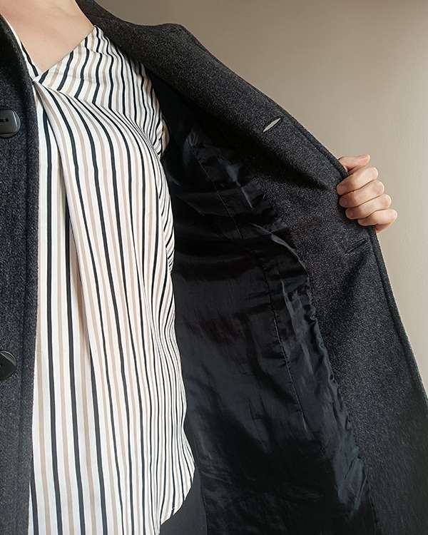 Abrigo de paño Gris liviano y elegante, tiene hombreras y forro interno. Talla M. Medidas: Hombro a hombro: 39cm / Axila a axila: 48cm / Largo de manga: 56cm / Largo total: 77cm