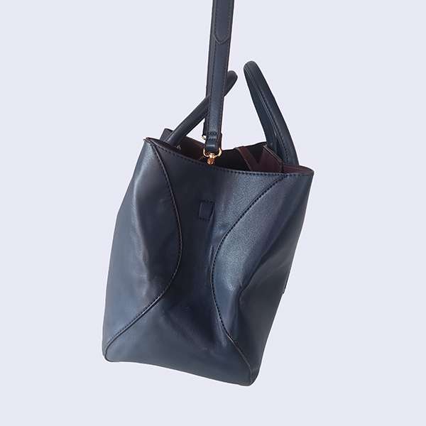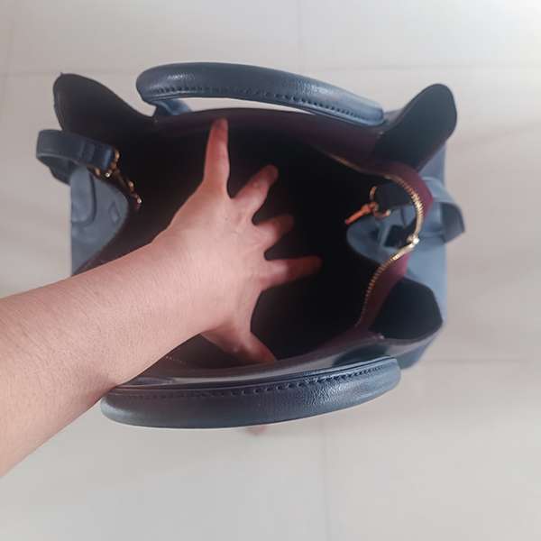 Bolso azul oscuro muy amplio, con correa y agarraderas. Tiene un bolsillo interno, herrajes dorados. La base mide 32cm x 17cm, tiene 26cm de alto. Es de cuero sintético, tiene una arruga en el lateral por el uso, se ve en la foto.