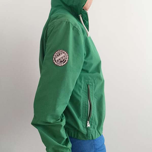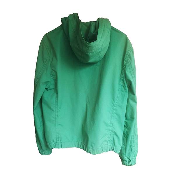 Chaqueta verde impermeable, tela plástica por dentro Talla L. Con cremalleras en los bolsillos y capota con cordón.Es muy bonita y vestidora, ideal para pase. Medidas: Hombro a hombro: 46.5cm/ Axila a axila 56.5cm / Largo total 61cm / Largo mangas 66cm. UNISEX