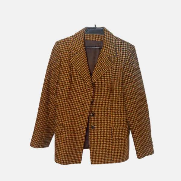 Blazer mostaza con gris oscuro, estampado gallineto. Ideal para la oficina o una pinta nativa. De lana, muy buen material y en excelente estado. Talla M. Medidas: Hombro a hombro: 40cm Largo manga: 60 cm Largo total: 72cm