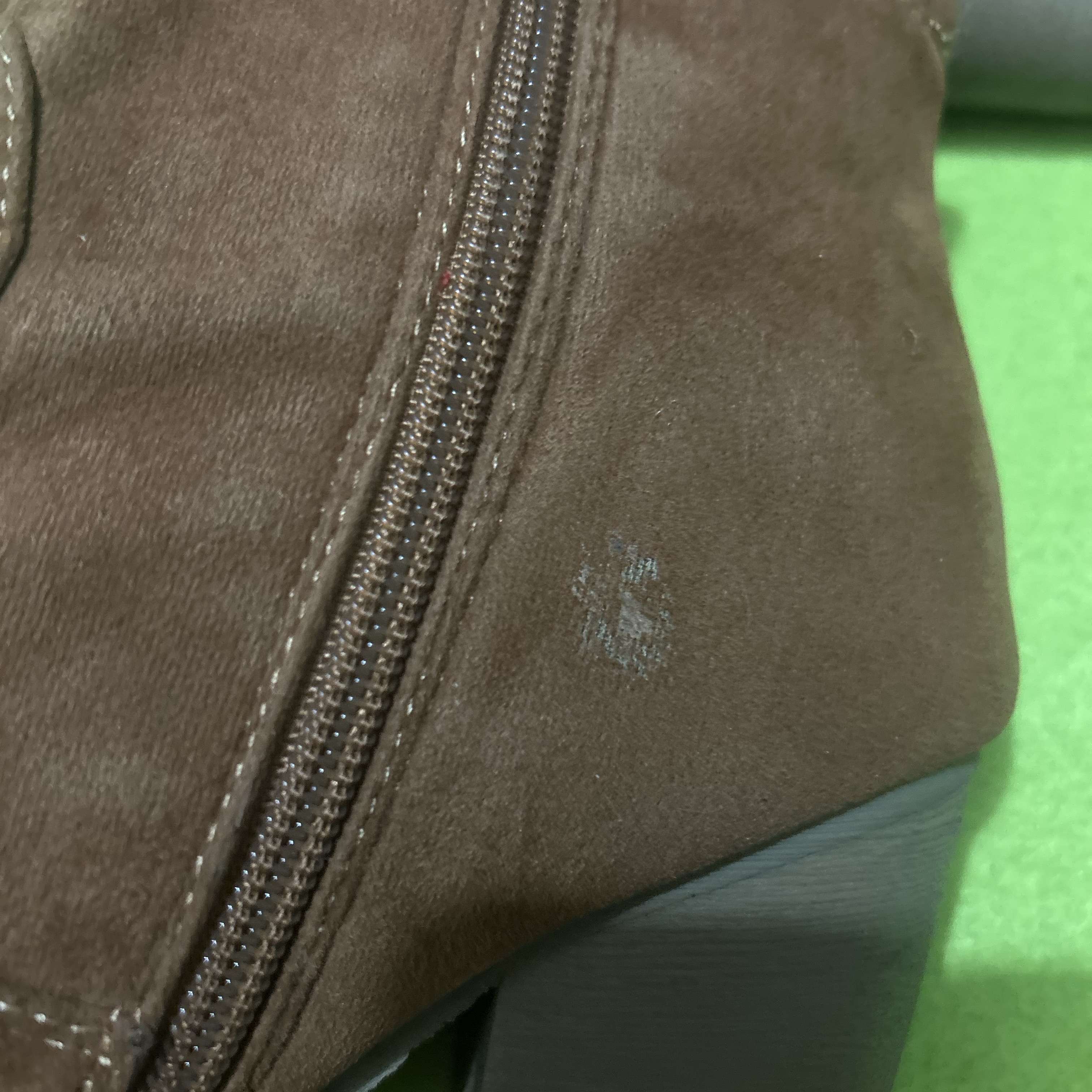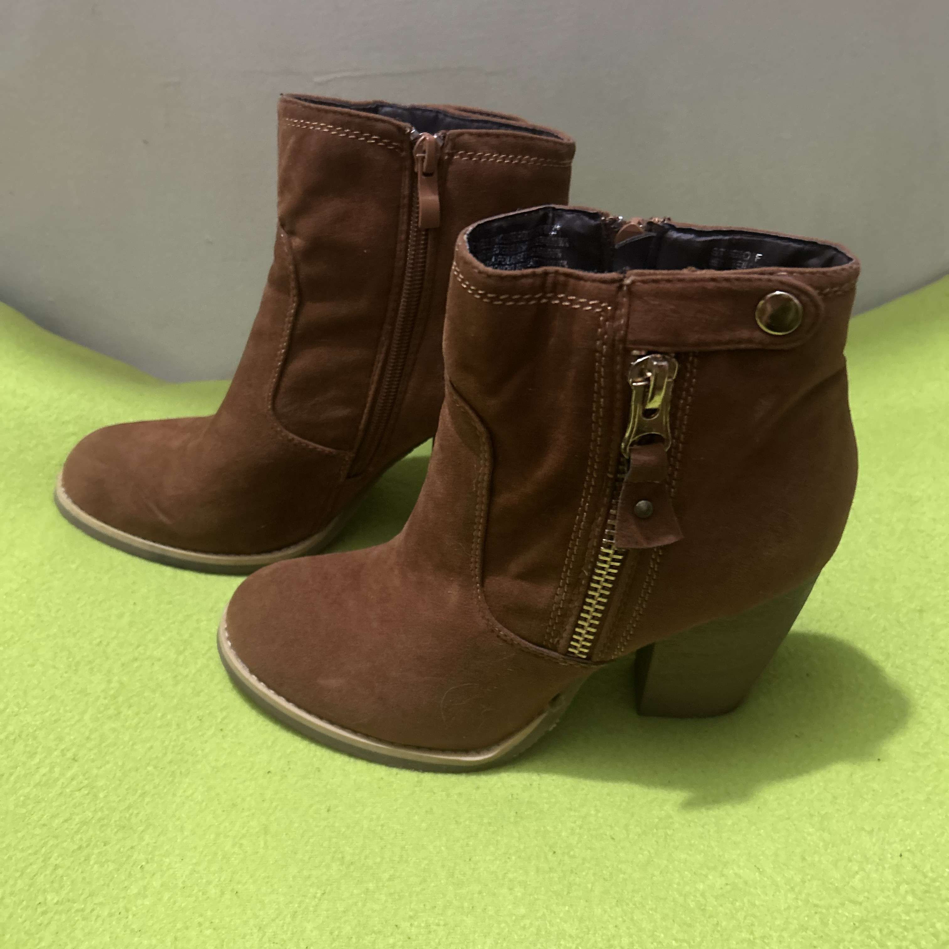 Botines en material sintético tipo gamuza, plantilla 25,5cms, tacón ancho 10 cms, talla 40. Tiene un detalle que se evidencia en la última foto.