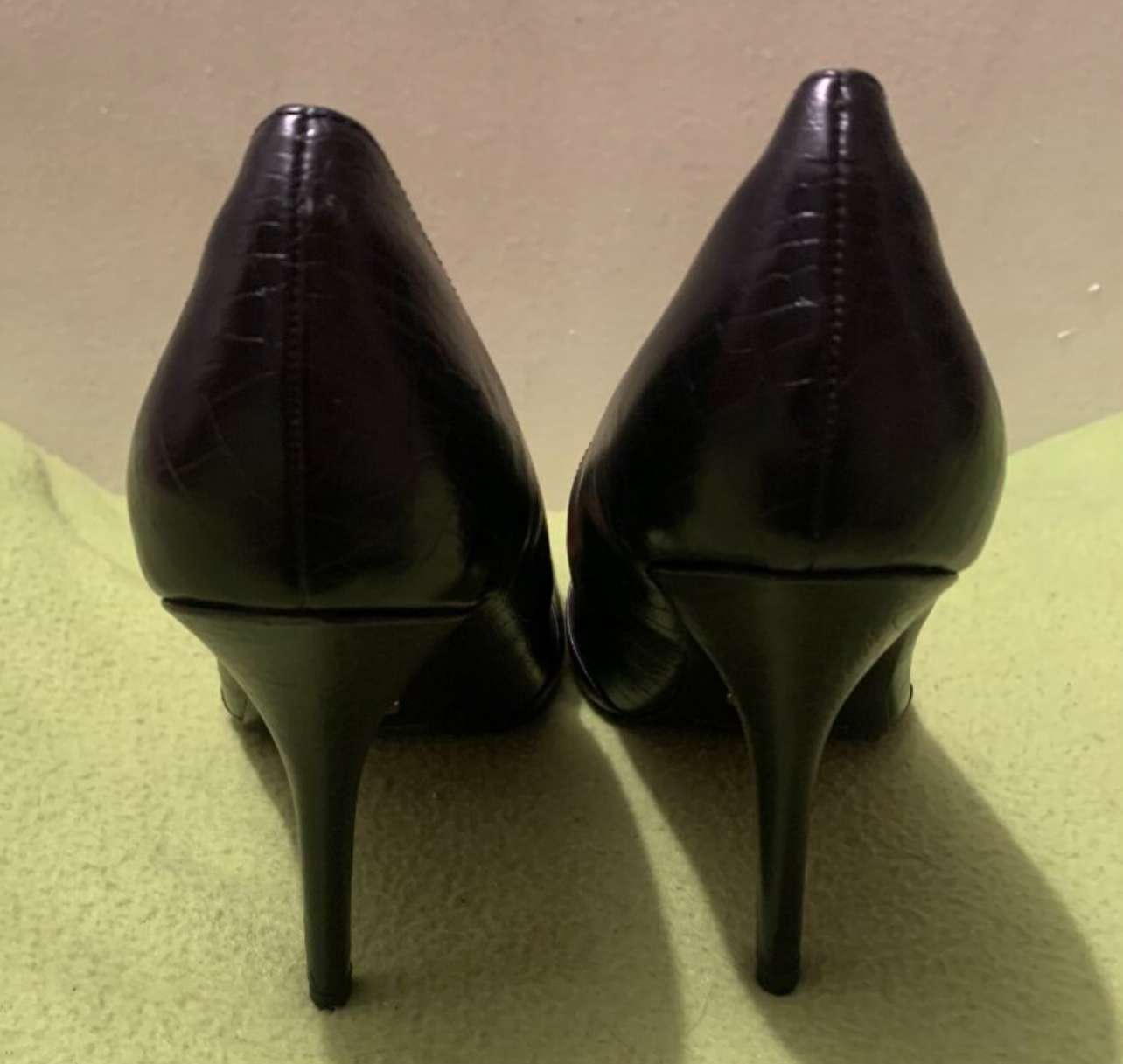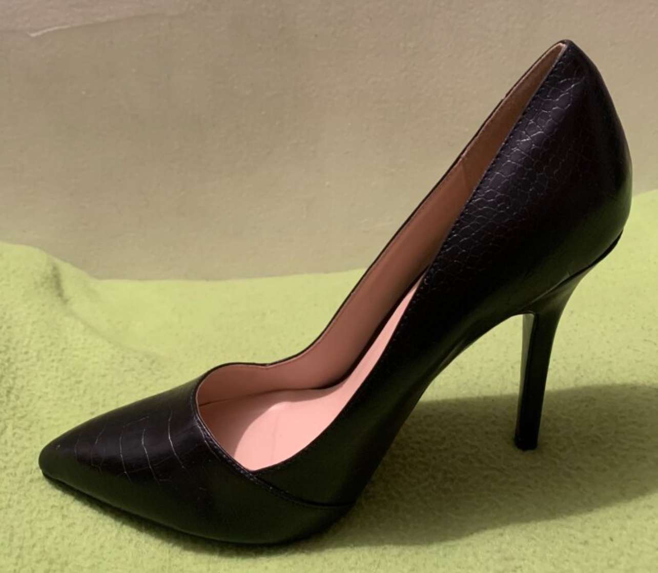 En material sintético, tamaño plantilla 25,5 cms, talla 39, altura tacon 10 cms.
